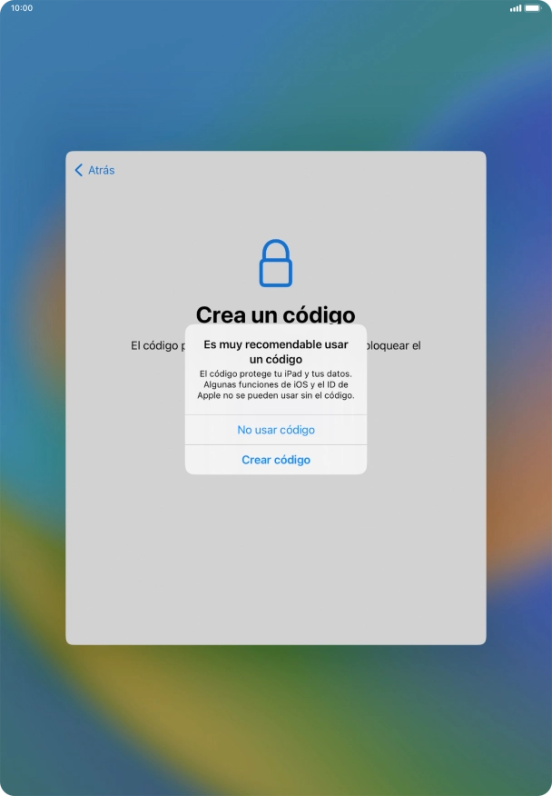 Sigue las indicaciones de la pantalla para activar el uso del código de seguridad o pulsa No usar código.