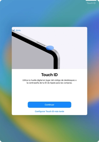 Sigue las indicaciones de la pantalla para activar el uso del sensor de identidad o pulsa Configurar Touch ID más tarde.