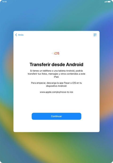 Para transferir contenido a tu tablet, tienes que haber instalado la app "Move to iOS" (Trasladar a iOS) en el dispositivo Android. Una vez se haya instalado la app, pulsa Continuar.