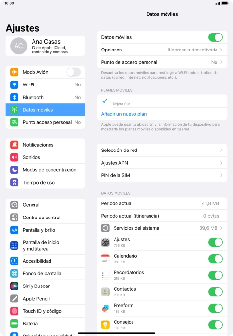 Pulsa el indicador junto a "Datos móviles" para activar o desactivar la función.