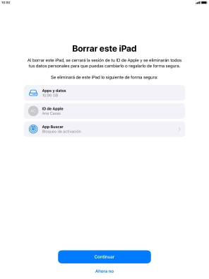 Pulsa Borrar iPad. Espera unos instantes mientras la tablet restablece la configuración predeterminada. Sigue las indicaciones de la pantalla para configurar la tablet y dejarla lista para su uso.