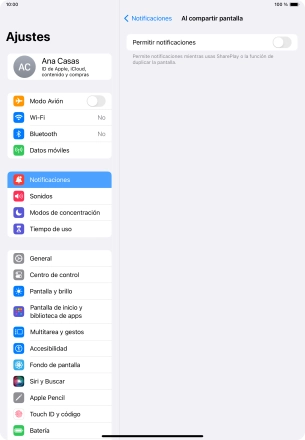 Puedes mostrar u ocultar las notificaciones cuando utilizas SharePlay o Screen Mirroring en la tablet.