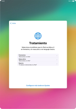 Sigue las indicaciones de la pantalla para elegir la forma de tratamiento deseada en la tablet, es decir, el masculino, el femenino o una forma de tratamiento neutra o pulsa Configurar más tarde en Ajustes.