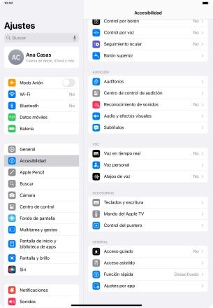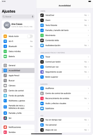 Puedes seleccionar diferentes ajustes para controlar la interacción con la tablet, por ejemplo AssistiveTouch, control por voz, seguimiento ocular, etc., para que te resulte más fácil navegar por la tablet.