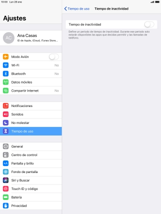 Pulsa el indicador junto a "Tiempo de inactivadad" y sigue las indicaciones de la pantalla para seleccionar el período de tiempo que debe durar el tiempo de inactividad.