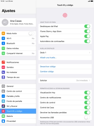 Puedes configurar la tablet para que utilice tu huella digital como código de seguridad o para validar tus compras en iTunes y App Store. Para poder utilizar el sensor de identidad, tienes que activar el código de seguridad.