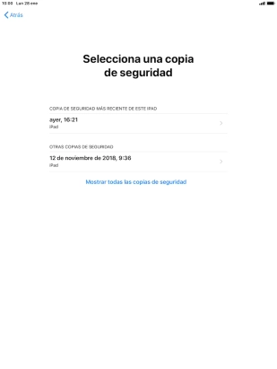 Pulsa la copia de seguridad deseada y espera mientras la tablet restaura el contenido anterior de la copia de seguridad seleccionada. Sigue a continuación las indicaciones de la pantalla para configurar la tablet y dejarla lista para su uso.