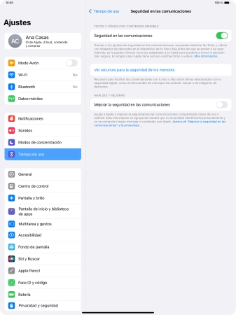La función de comunicación segura registra contenido sensible en las fotografías y los vídeos que se envían y reciben en los dispositivos Apple seleccionados además de proporcionar información y avisos sobre este contenido. Puedes utilizar esta función en relación con el ajuste de Tiempo de pantalla de tu grupo familiar.