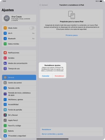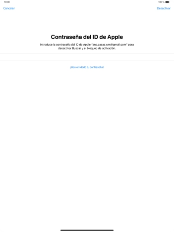 Introduce la contraseña de tu ID de Apple y pulsa Desactivar. Espera unos instantes mientras la tablet restablece la configuración predeterminada. Sigue las indicaciones de la pantalla para configurar la tablet y dejarla lista para su uso.