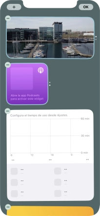 Puedes utilizar los widgets del teléfono para tener una vista rápida de las apps que has elegido como tus favoritas. Puedes elegir entre diferentes tamaños de widgets, organizarlos en grupos e insertarlos en la pantalla de inicio.
