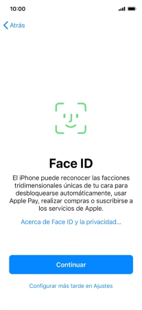 Sigue las indicaciones de la pantalla para activar el uso del reconocimiento facial (Face ID) o pulsa Configurar más tarde en Ajustes.