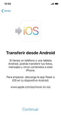 Para transferir contenido a tu teléfono, tienes que haber instalado la app "Move to iOS" (Trasladar a iOS) en el teléfono Android. Una vez se haya instalado la app, pulsa Continuar.