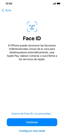 Sigue las indicaciones de la pantalla para activar el uso del reconocimiento facial (Face ID) o pulsa Configurar más tarde.