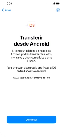 Para transferir contenido a tu teléfono, tienes que haber instalado la app "Move to iOS" (Trasladar a iOS) en el teléfono Android. Una vez se haya instalado la app, pulsa Continuar.