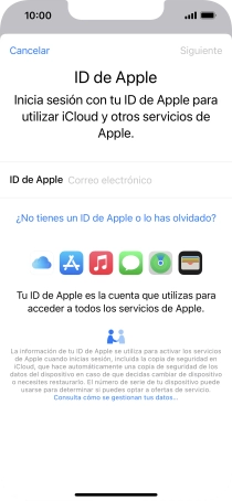 Si no tienes un ID de Apple, pulsa ¿No tienes un ID de Apple o lo has olvidado? y sigue las indicaciones de la pantalla para ver cómo crear un ID de Apple.