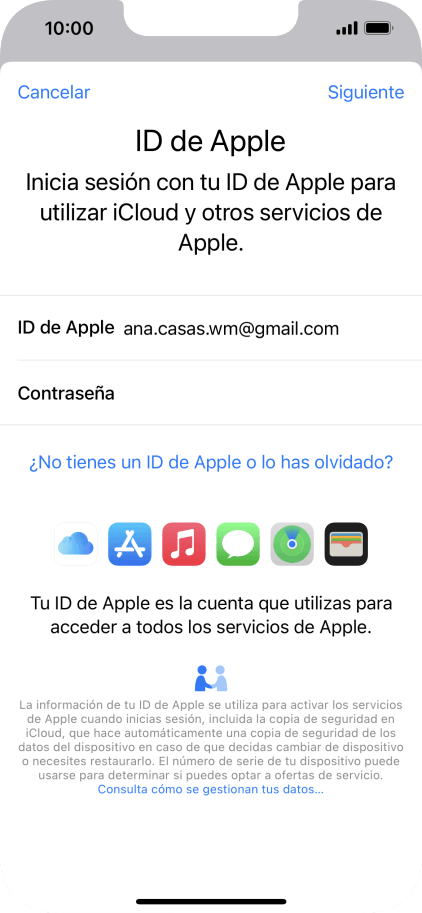 Si no tienes un ID de Apple, pulsa ¿No tienes un ID de Apple o lo has olvidado? y sigue las indicaciones de la pantalla para ver cómo crear un ID de Apple.