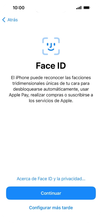 Sigue las indicaciones de la pantalla para activar el uso del reconocimiento facial (Face ID) o pulsa Configurar más tarde.
