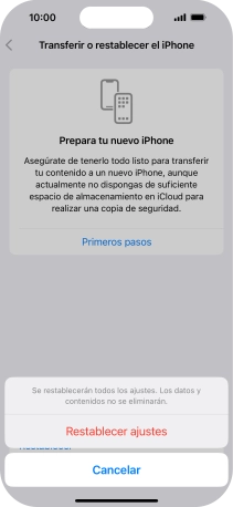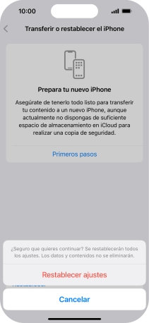 Pulsa Restablecer ajustes. Espera unos instantes mientras el teléfono restablece la configuración predeterminada. Sigue las indicaciones de la pantalla para configurar el teléfono y dejarlo listo para su uso.