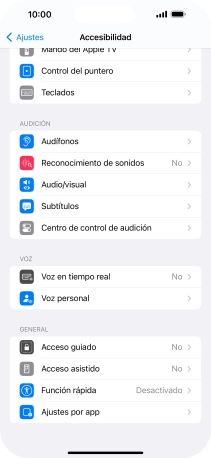 Puedes seleccionar diferentes ajustes para controlar la interacción con el teléfono, por ejemplo AssistiveTouch, el control por voz, etc., para que te resulte más fácil navegar por el teléfono.