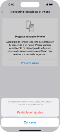 Pulsa Restablecer ajustes. Espera unos instantes mientras el teléfono restablece la configuración predeterminada. Sigue las indicaciones de la pantalla para configurar el teléfono y dejarlo listo para su uso.