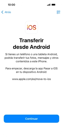 Para transferir contenido a tu teléfono, tienes que haber instalado la app "Move to iOS" (Trasladar a iOS) en el teléfono Android. Una vez se haya instalado la app, pulsa Continuar.