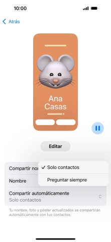 Para poder seleccionar el ajuste de cómo compartir tu póster de contacto, debes activar la función de compartir tu nombre e imagen.
