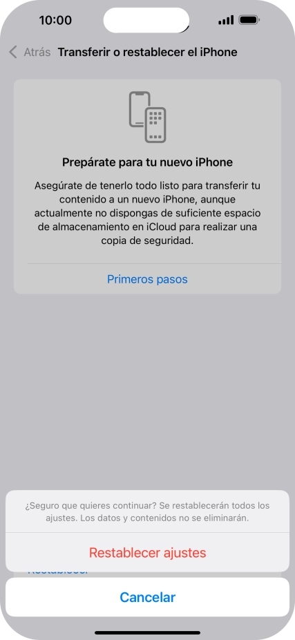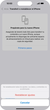 Pulsa Restablecer ajustes. Espera unos instantes mientras el teléfono restablece la configuración predeterminada. Sigue las indicaciones de la pantalla para configurar el teléfono y dejarlo listo para su uso.