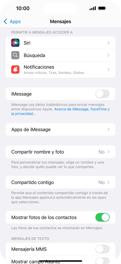 Pulsa el indicador junto a "iMessage" para activar la función.
