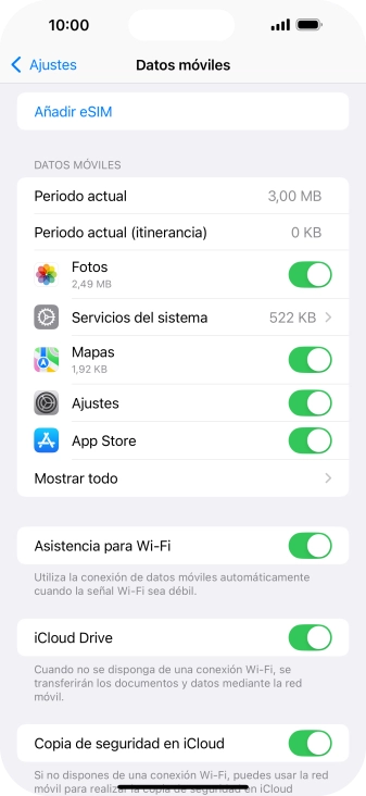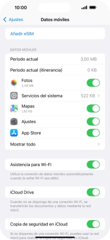 Pulsa el indicador junto a "Datos móviles" para activar o desactivar la función.