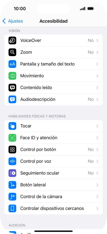 Puedes seleccionar diferentes ajustes para controlar la interacción con el teléfono, por ejemplo, AssistiveTouch, control por voz, seguimiento ocular, manejo de la cámara, etc., para que te resulte más fácil navegar por el teléfono.