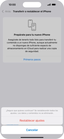 Pulsa Restablecer ajustes. Espera unos instantes mientras el teléfono restablece la configuración predeterminada. Sigue las indicaciones de la pantalla para configurar el teléfono y dejarlo listo para su uso.