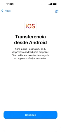 Para transferir contenido a tu teléfono, tienes que haber instalado la app "Move to iOS" (Trasladar a iOS) en el teléfono Android. Una vez se haya instalado la app, pulsa Continuar.
