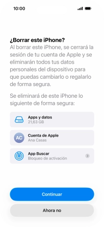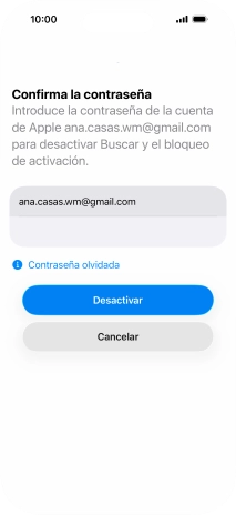 Introduce la contraseña de tu Cuenta de Apple y pulsa Desactivar. Espera unos instantes mientras el teléfono restablece la configuración predeterminada. Sigue las indicaciones de la pantalla para configurar el teléfono y dejarlo listo para su uso.