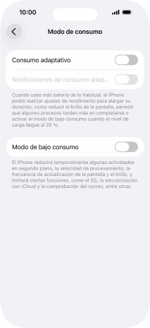 Si activas el consumo adaptativo, se utiliza Apple Intelligence para averiguar si el teléfono está usando más batería de lo normal. En ese caso, se llevarán a cabo de forma automática pequeños ajustes de brillo o de apps en ejecución para que la batería del teléfono dure más. Para poder utilizar la función, tienes que activar Apple Intelligence.