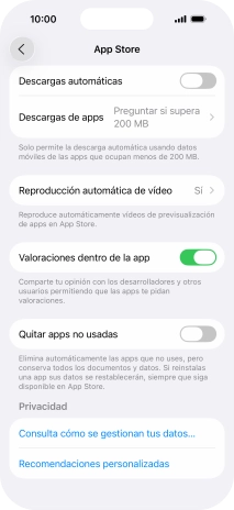 Puedes configurar el teléfono para que elimine de forma automática las apps que llevas sin utilizar mucho tiempo para poder liberar espacio en la memoria del teléfono. Todos los ajustes y los datos de las apps se guardan y se restauran cuando vuelves a instalar la app de App Store.