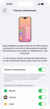 Puedes utilizar Apple Intelligence para priorizar las notificaciones más importantes y urgentes. Las notificaciones con alta prioridad aparecerán en la parte superior de la vista de notificaciones. Para poder utilizar la función, tienes que activar Apple Intelligence.