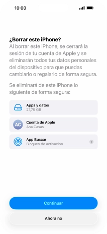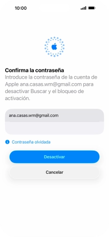 Introduce la contraseña de tu Cuenta de Apple y pulsa Desactivar. Espera unos instantes mientras el teléfono restablece la configuración predeterminada. Sigue las indicaciones de la pantalla para configurar el teléfono y dejarlo listo para su uso.
