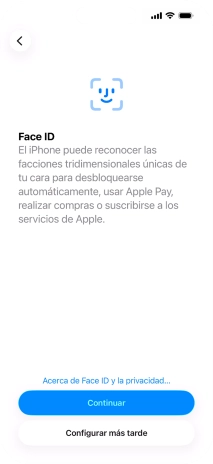 Sigue las indicaciones de la pantalla para activar el uso del reconocimiento facial (Face ID) o pulsa Configurar más tarde.
