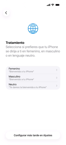 Sigue las indicaciones de la pantalla para elegir la forma de tratamiento deseada en el teléfono, es decir, el masculino, el femenino o una forma de tratamiento neutra o pulsa Configurar más tarde en Ajustes.