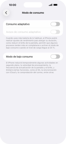 Si activas el consumo adaptativo, se utiliza Apple Intelligence para averiguar si el teléfono está usando más batería de lo normal. En ese caso, se llevarán a cabo de forma automática pequeños ajustes de brillo o de apps en ejecución para que la batería del teléfono dure más. Para poder utilizar la función, tienes que activar Apple Intelligence.