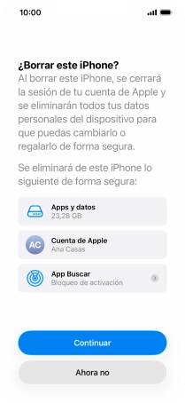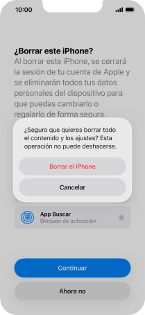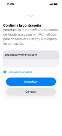 Introduce la contraseña de tu Cuenta de Apple y pulsa Desactivar. Espera unos instantes mientras el teléfono restablece la configuración predeterminada. Sigue las indicaciones de la pantalla para configurar el teléfono y dejarlo listo para su uso.