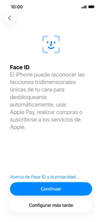 Sigue las indicaciones de la pantalla para activar el uso del reconocimiento facial (Face ID) o pulsa Configurar más tarde.