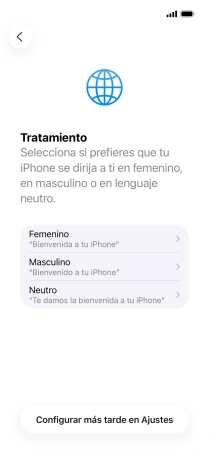 Sigue las indicaciones de la pantalla para elegir la forma de tratamiento deseada en el teléfono, es decir, el masculino, el femenino o una forma de tratamiento neutra o pulsa Configurar más tarde en Ajustes.