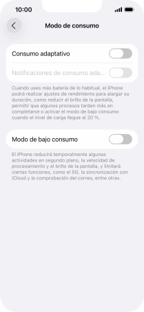 Si activas el consumo adaptativo, se utiliza Apple Intelligence para averiguar si el teléfono está usando más batería de lo normal. En ese caso, se llevarán a cabo de forma automática pequeños ajustes de brillo o de apps en ejecución para que la batería del teléfono dure más. Para poder utilizar la función, tienes que activar Apple Intelligence.