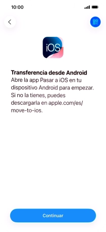 Para transferir contenido a tu teléfono, tienes que haber instalado la app "Move to iOS" (Trasladar a iOS) en el teléfono Android. Una vez se haya instalado la app, pulsa Continuar.