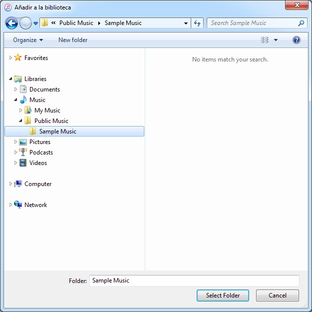 Haz clic en Añadir carpeta a la biblioteca... para añadir una carpeta.