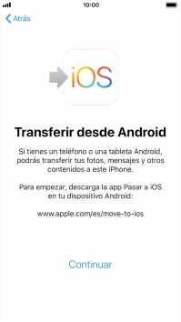 Para transferir contenido a tu teléfono, tienes que haber instalado la app "Move to iOS" (Trasladar a iOS) en el teléfono Android. Una vez se haya instalado la app, pulsa Continuar.