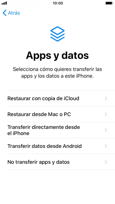Puedes restaurar el contenido de una copia de seguridad en iCloud cuando el teléfono se activa antes de utilizarlo por primera vez y cuando lo restableces. Cuando aparece esta imagen de pantalla, tu teléfono está listo para restaurar el contenido de una copia de seguridad en iCloud.