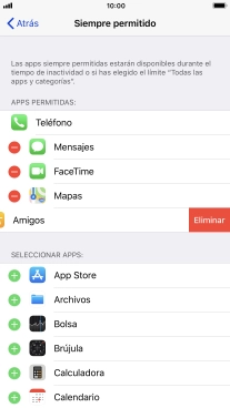 Pulsa el icono de eliminar junto a la app deseada para borrarla de la lista de apps permitidas bajo el tiempo de inactividad de pantalla.