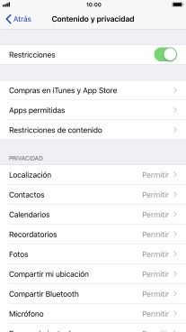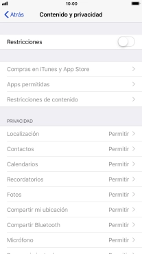 Pulsa el indicador junto a "Restricciones" y sigue las indicaciones de la pantalla para seleccionar los ajustes del contenido y de las limitaciones privadas.